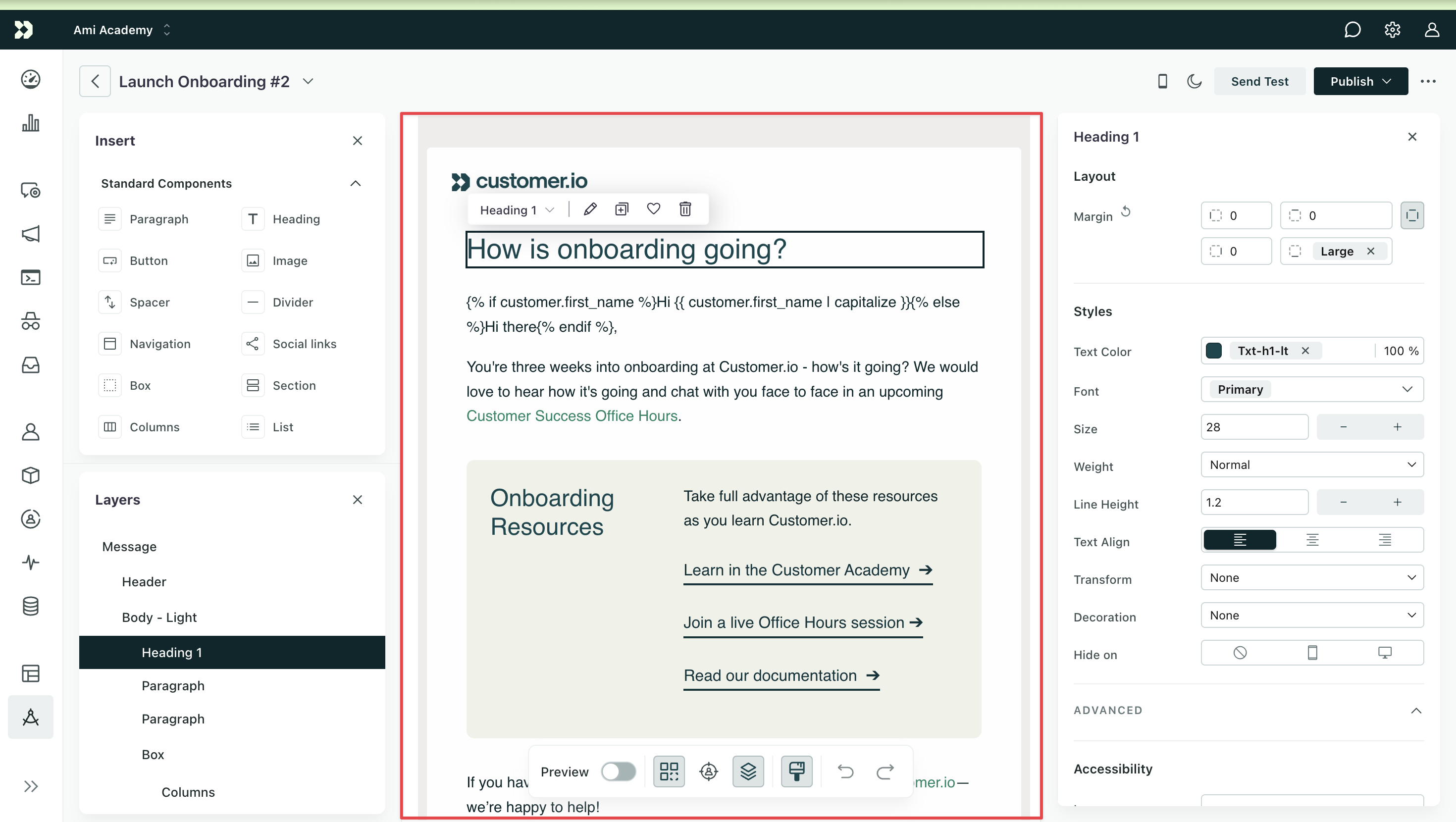 Standard components include out-of-the-box elements like headings, paragraphs, and buttons. Use these to quickly structure and style your messages. Custom components are reusable blocks of content created by your team. You won’t see custom components in the menu until you’ve created your first one.